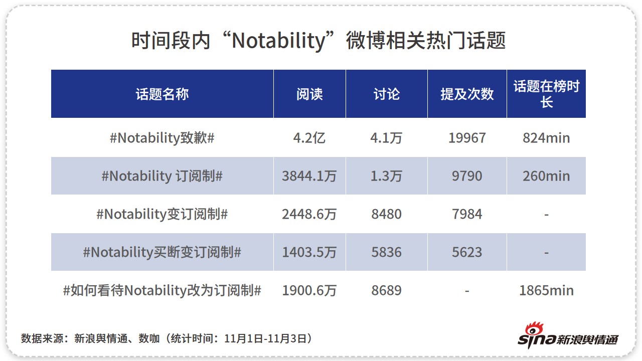 据政企舆情大数据服务平台新浪舆情通统计,自11月2日Notability推送版本更新后,其“改买断制变订阅制”一事的全网相关信息就迅速攀升,且敏感信息呈同步上涨态势;11月2日14时和11月3日11时,舆论敏感声量达到两个小高峰。
